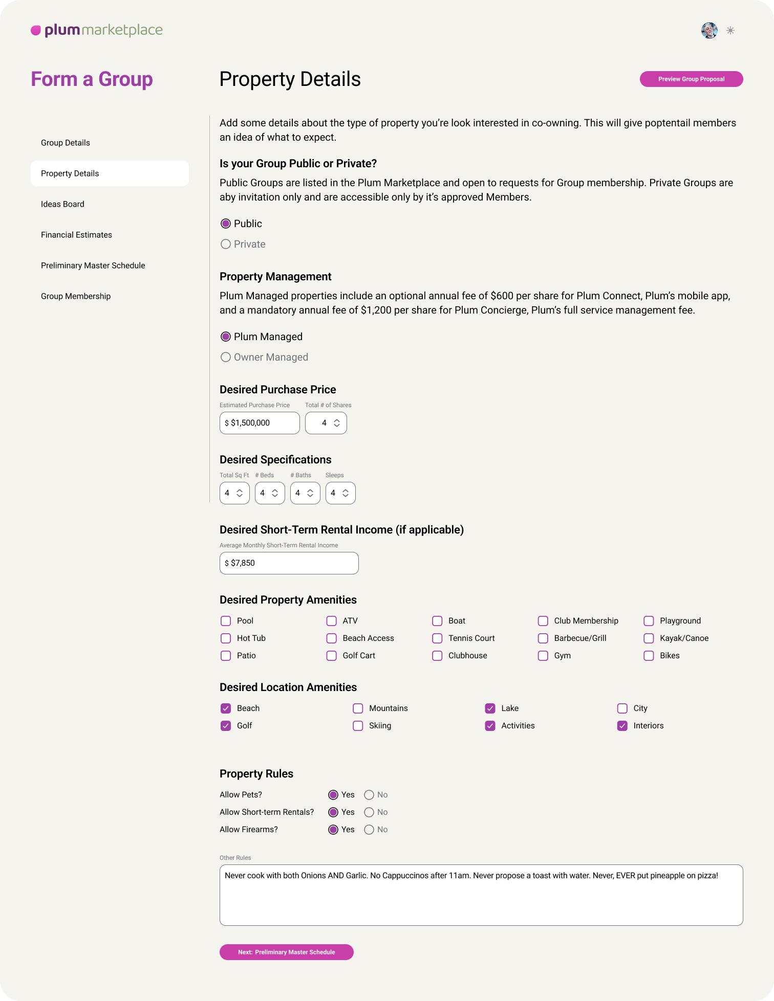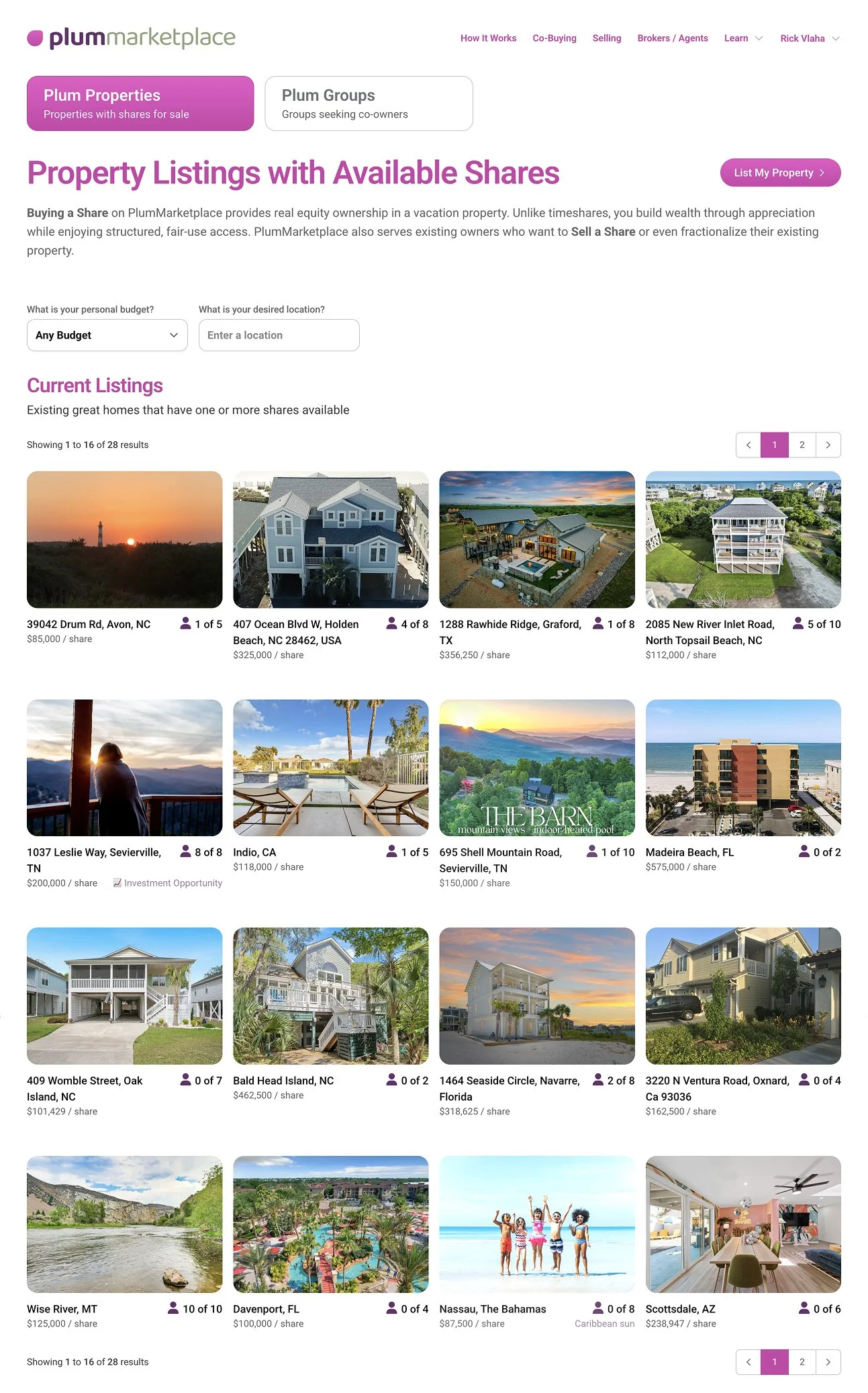Browse existing groups forming on PlumMarketplace or get matched with compatible co-owners based on your preferences, budget, and desired location.